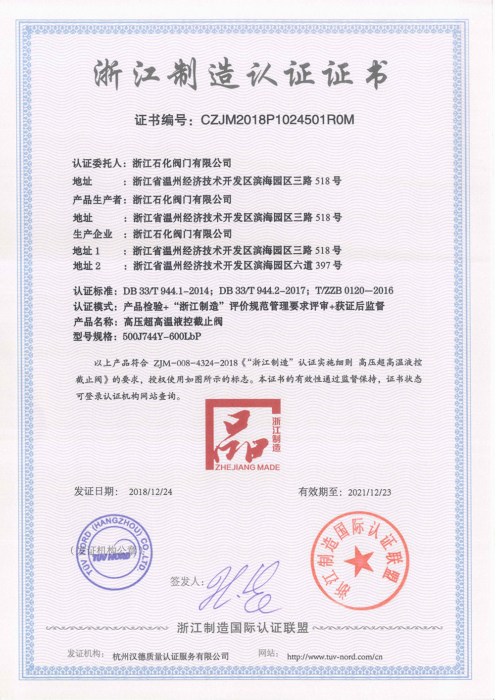 我公司于2018年12月通過了《高壓超高溫液控截止閥》的浙江制造認(rèn)證證書,為了深入推進“三強一制造”建設(shè),打響“品字標(biāo)浙江制造”品牌,浙江制造推行了“品字標(biāo)”企業(yè)“四個百分百”計劃,努力實現(xiàn)“品字標(biāo)”企業(yè)廠區(qū)車間100%亮標(biāo)、質(zhì)量承諾100%公示、品牌產(chǎn)品100%貼標(biāo)、廣告宣傳100%植入,以此不斷提升“品字標(biāo)”品牌的社會知名度、認(rèn)可度和美譽度。